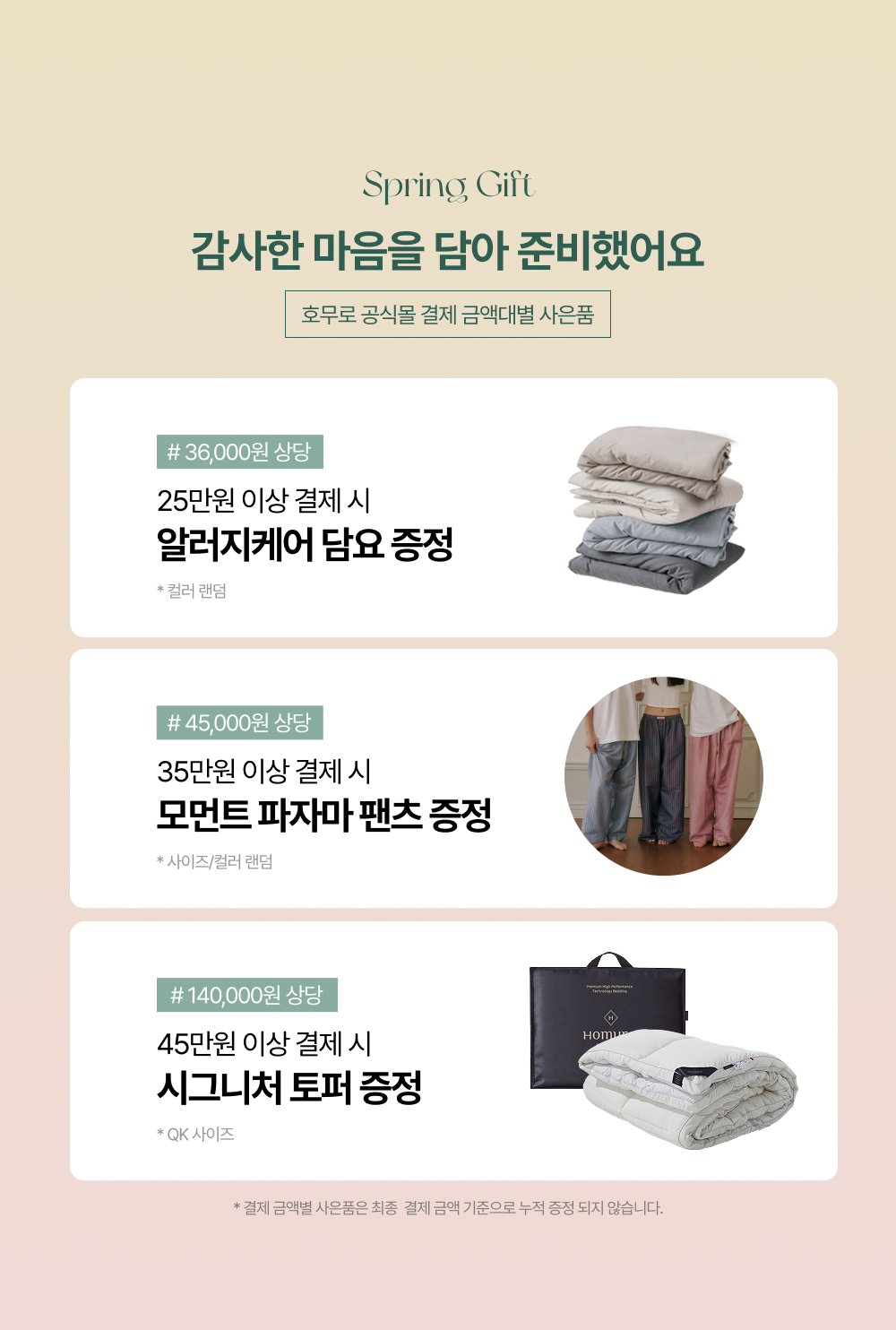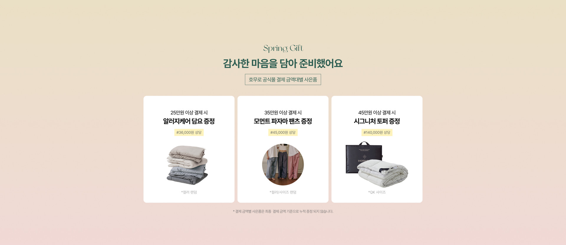 * 금액대별 사은품의 경우 누적 증정되지 않으며, 카드사 청구 할인 적용 시 적용 후 최종 결제 금액 기준으로 증정됩니다.