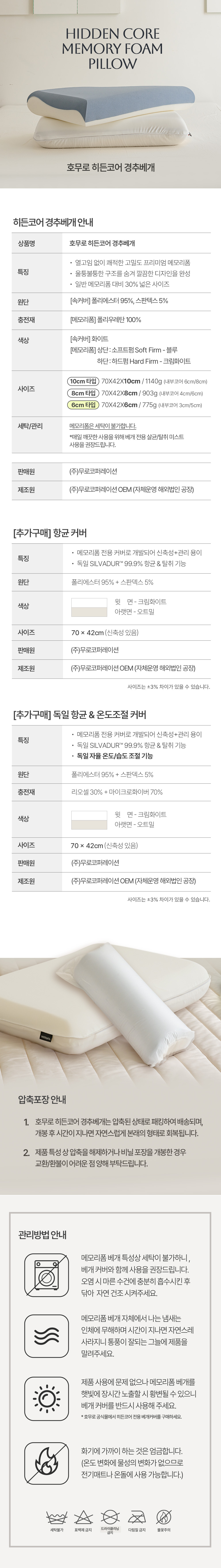 1) 메모리폼은 세탁이 불가하므로 베개커버와 사용을 권장드립니다.